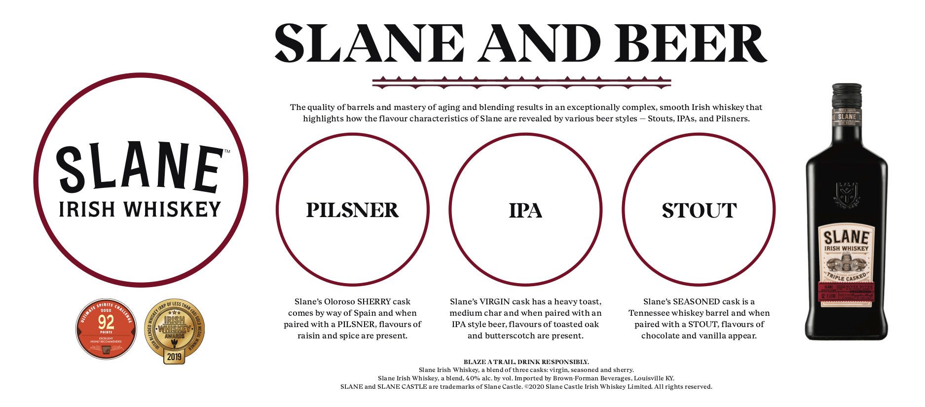 Pilsners are known to be crisp and refreshing. Slane's Oloroso SHERRY cask contributes flavours of raisins and spice and when sipped together the bitterness of the pilsner's dry and crisp nature enhances the sweet dry and dark fruit flavours of Slane Irish Whiskey.